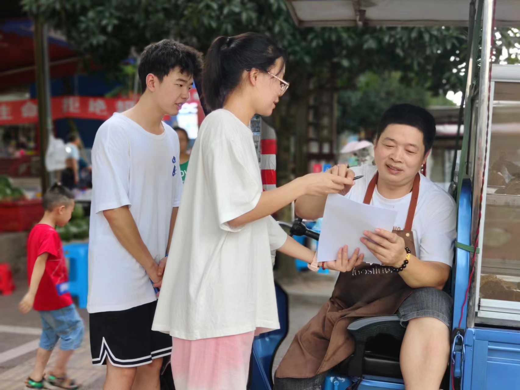 分水岭油纸伞工艺的使用和传承,至少可以上溯到明代,制作历史超过四百年。分水岭油纸伞传统制作技艺被誉为“中国民间伞艺的活化石”。分水油纸伞以泸州当地盛产的桐油、楠竹、水竹、岩桐木、皮纸等为原料用以制作,伞面诗画兼备。从伞里景区到小镇街道,一路上是人间烟火,感受到古镇的韵味,走在街道上有好多村民在做油纸伞,炎热的天气也没能让伞将们停下手里的工作。镇上没有博物馆,但能看到仍有很多人坚守着伞的古老工艺。伞韵团队通过线上线下同时开展问卷调查的方式,在街道上找到村民沟通交流并让他们填写了纸质调查问卷,队员们感受到了村民的淳朴热情,收获了满满的善意。村民们大多都购买过油纸伞,对油纸伞的传承也是高度重视。在调查过程中,还遇到了当地的支书,关于问卷内容中对油纸伞的了解程度,他说:“说十分了解是不可能的”,村民们都十分坦诚,同时还体现出油纸伞文化的传承与推广任重道远。