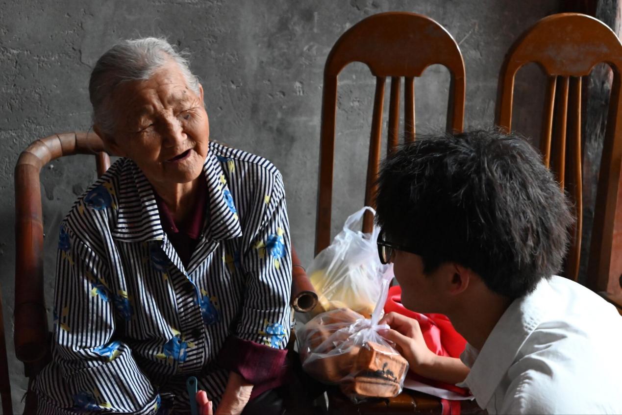第一位老人是90多岁高龄的老奶奶,精神十足,只是身体功能有正常的老化,和我们聊天时快乐溢于言表。“我大女儿70多岁了,她就在旁边的古镇上忙,早上就把我带这边来让我自己休息。”奶奶年纪大了,眼睛看的不是很清晰,耳朵也不似年轻时灵敏。她坐在门外的木椅上摇着广告宣发的塑料扇子,待我们靠近说话后才发觉我们的到来,她也不住的抱歉,因为没法招待我们,需要我们声音大一些,不住得推脱带来的礼物,“一路一路过来到这里,又热又累的,娃儿些自己拿着吃,我不用。”奶奶虽不是独居,但大女儿也70多了,这对母女就相互依靠着生活在这个小村中,实践队成员在奶奶这里呆了半个多小时,陪她聊了许久才不舍地离开了。
