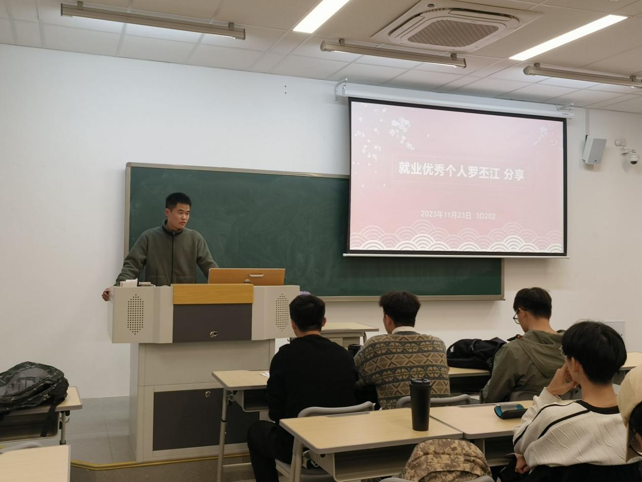 朋辈助力。推进会第三项议程,2024届就业优秀个人罗丕江同学结合自己的求职经历,向同学们分享了如何在面试、职场沟通、团队协作等方面取得优势的经验。他鼓励同学们要树立自信心,勇于面对挑战,把握每一个机会,努力实现自己的职业理想。罗丕江还特意提醒同学们,在求职过程中要注重个人形象的塑造,充分展示自己的专业素养和团队精神,积极与面试官沟通,为顺利就业创造有利条件。同时他也强调在签约前要明确自己的的意向,避免出现违约的情况。