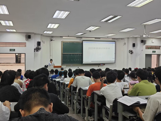 为激发广大同学们的爱国热情,让他们了解西部、服务西部,展现青春风采。在宣讲会上,陈莉萍老师详细介绍了西部计划专项内容、选拔标准、相关政策等,让同学们对项目有了全面的认识。现场还播放了反映西部计划志愿者亲身经历的视频,使同学们更加深入地了解西部计划。并在会议结束后和同学们就西部计划的主要内容、报名要求和流程等问题进行了积极讨论。
