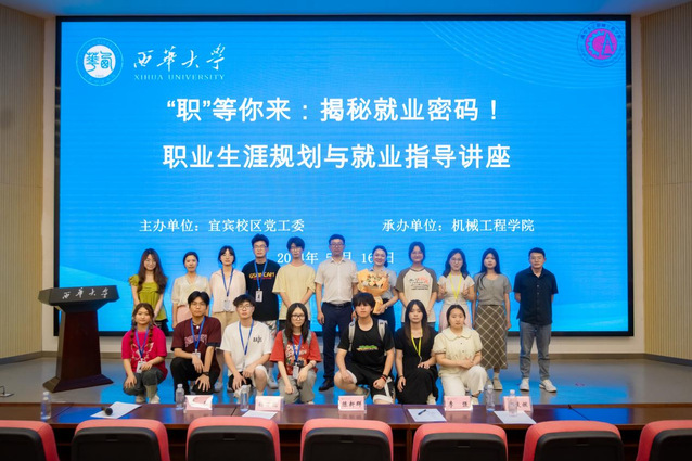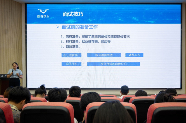 点击:164 为全力助推2024届毕业生高质量充分就业,抢抓就业关键期,搭建校企合作平台,做实做细就业服务工作,5月16日,在西华大学宜宾校区101报告厅,成功举行由校区党工委主办,机械工 程学院“机育”职业发展与就业咨询工作室承办的“‘职’等你来:揭秘就业密码”职业生涯规划与就业指导专题讲座。讲座邀请到宜宾凯翼汽车有限公司人力资源经理陈新群,她以“坚定信念,追逐梦想——当代青年如何顺利走上工作岗位”的主题为同学们开展职业生涯规划与就业指导。宜宾校区学生工作办公室主任杨万能、bv伟德国际体育官方网站党委副书记 纪委书记李强,bv伟德国际体育官方网站辅导员薛敏、周岐燃,来自宜宾校区bv伟德国际体育官方网站、经济学院、汽车学院、计算机学院、管理学院和文新学院近300名学生参与讲座。
