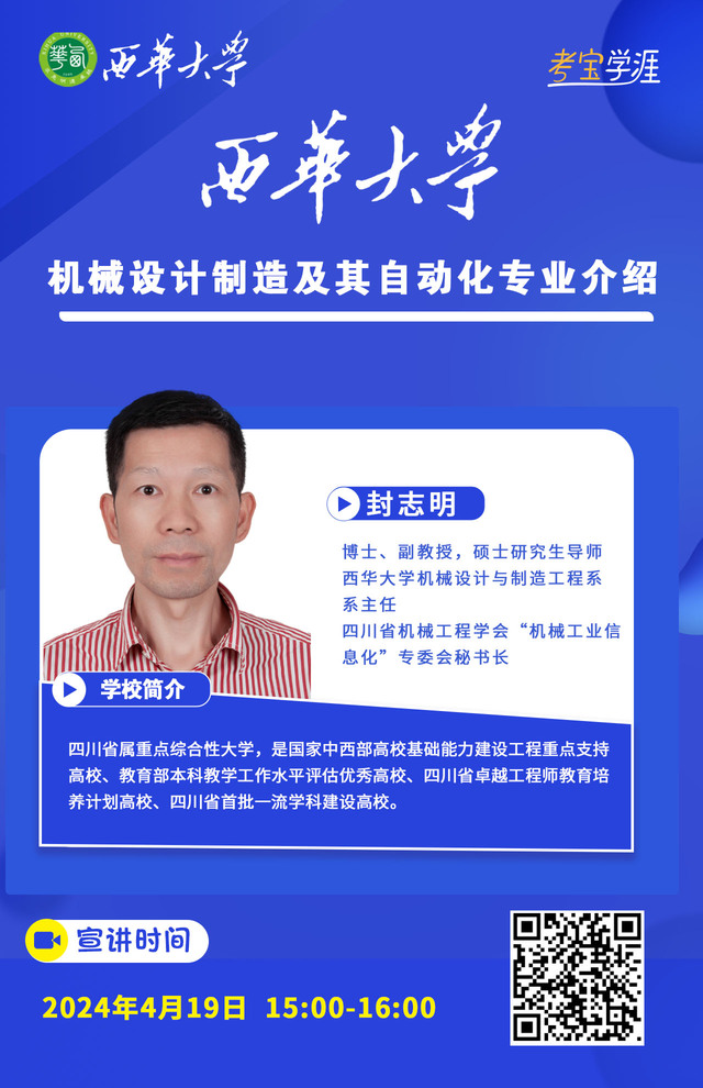 为帮助2024届考生和家长更好地了解西华大学bv伟德国际体育官方网站各专业优势和特色,西华大学bv伟德国际体育官方网站特推出教授“说”专业线上招生宣讲,机械设计制造及其自动化、机械电子工程、农业机械化及其自动3个专业的教授现身直播间,与大家“零距离”交流互动,与你说专业、说就业,为你解析专业办学特色、学科优势、培养方案等。