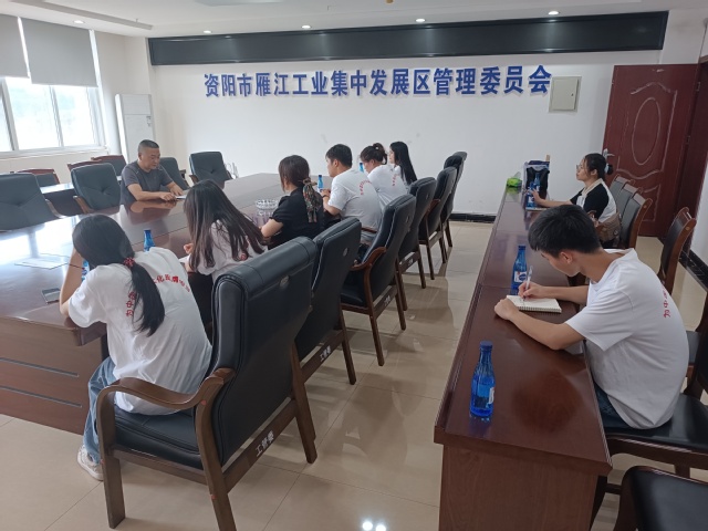 最后,实践团队和资阳市雁江区工业集中发展区管理委员会尹主任开展交流学习座谈会。会上,尹主任为同学们深入浅出地讲解了雁江区的经济结构与三大支柱产业:天然气,食品饮料,医药。除此之外,另就当代大学生忧愁的就业问题提出了四种常见招聘方式:自主招聘,团队招聘,人才市场招聘,网络招聘等方式,为同学们解疑答惑,让大家了解到了多种招聘方式,既增添知识又拓宽了眼界。
