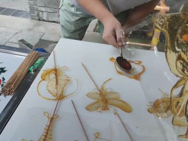 在交谈中我们得知,这位糖画师已经有了近30年的糖画制作经历。他的制作技艺来自于他的祖辈,他自幼便跟随家中长辈制作糖画并以此为生,糖画师表示“糖画作为一种具有悠久历史的传统手工艺术,在中国民间文化中占有重要地位”。从他的口中,我们了解到糖画的发展历程。糖画起源于明代“糖丞相”,历经宋、明、清等朝代的演变与传承,至今已有数百年的历史,进入近现代以来糖画虽然面临一些挑战但在糖画师的努力和社会各界的关注下仍然得以延续和发展。如今,糖画已经成为中国传统文化的一张名片代表着中华民族的文化创造力和手工艺人的智慧与匠心。