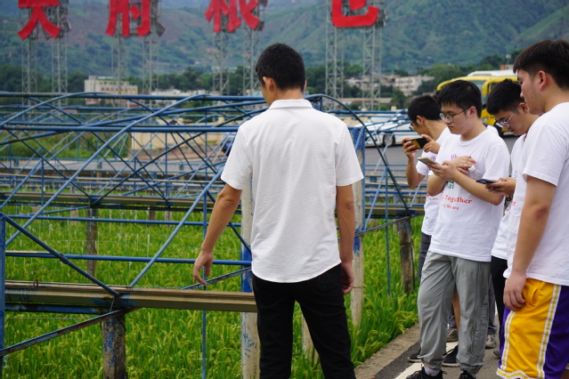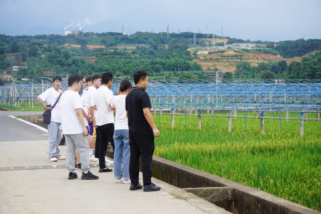 下一站去到了米易县的天府粮仓——撒莲镇安全村。在曾书记的介绍下,我们了解到撒莲镇政府结合当地实际情况探索农业发展之路并取得巨大成功的原因。米易县优越的气候条件,稻菜轮作成为一大特色,独创的水泥大棚,相比传统钢管大棚,使用寿命可达十几年,进一步降低了生产成本,加之光照等自然条件,水稻亩产量是一般产地的三倍。随后我们前往农业示范园观景台,俯瞰米易稻菜轮作产业园。水稻收获后,利用大棚可以种植番茄、茄子、四季豆等早市蔬菜,利用季节差,将土地利用率和产业收益率做到最大化。曾书记指着整齐的农田向我们讲述这些年安全村农业发展的历程:“乘着高标准农田建设项目的春风,安全村大部分土地纳入了统一规划和建设,每一块田都配备了机耕道、灌水渠、排水渠等基础设施建设完善,为后续稻菜高产和运输提供了硬件保障。”在离开前,曾书记也留给团队一个问题,希望可以针对当地的水泥大棚研制简单实用的农业机械,提高稻田生产机械化水平,同时他关于农业示范园后续的发展,向社会实践团表达了打造新时代更高水平的天府粮仓的底气和愿景。