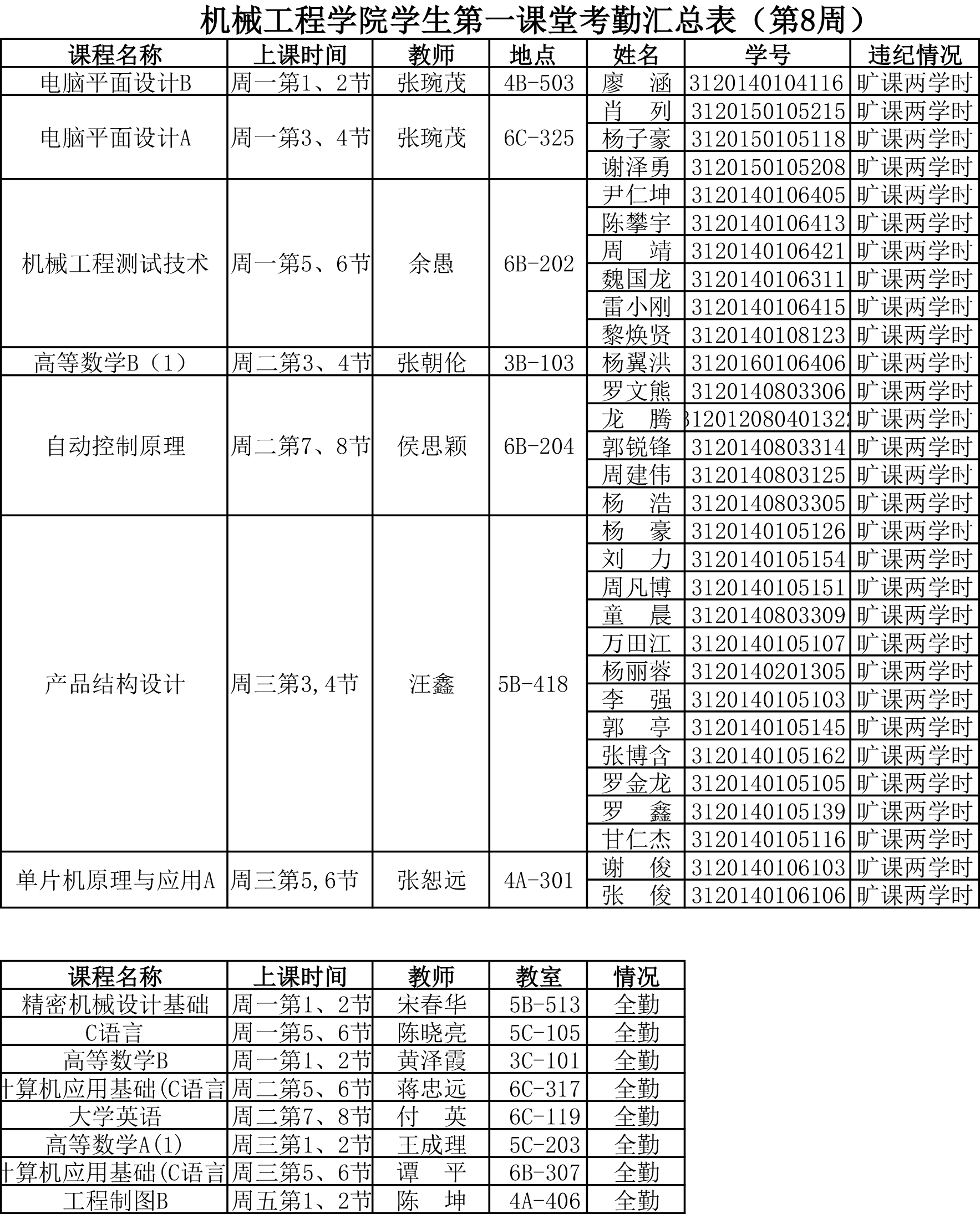 【考勤公示】第八周学院学生第一课堂考勤公示