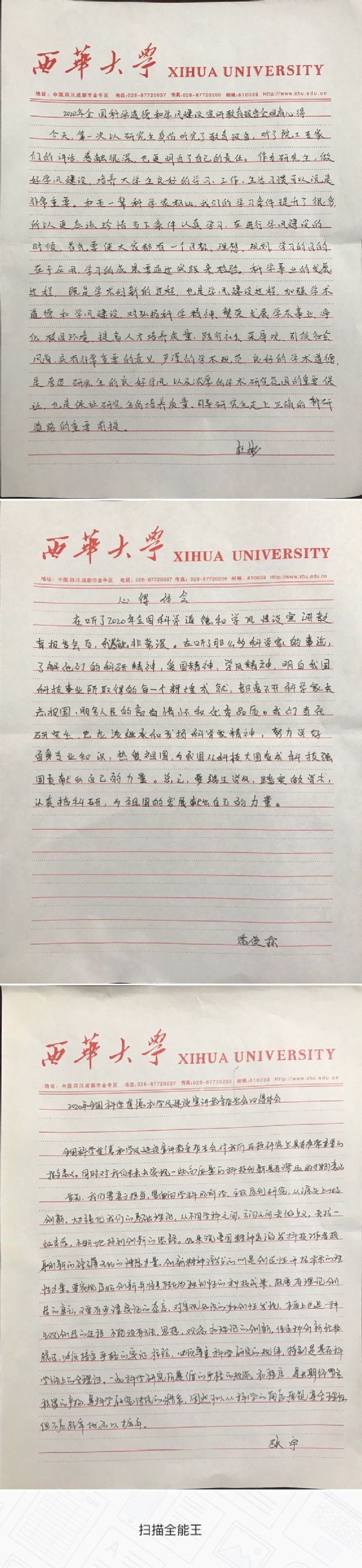 冯叶陶: 今天下午在学院统一组织下,通过网络直播的方式观看了“2020年全国科学道德和学风建设宣讲教育报告会”,听完报告会我谨记在心的是在科研的道路上,创新和学术诚信是必不可少的品格。学风是学习者治学态度的具体表现,这不仅仅反映出人格劣势、志向的远近,更关系到能否最终成长为国家和名族的科技精英。