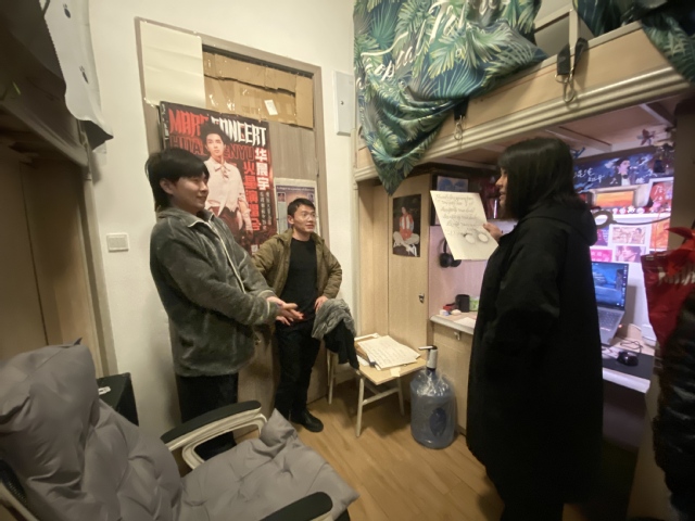 会后,陈艺丹、李忠钢两位老师与毕业班辅导员深入毕业生宿舍,开展关怀慰问与就业指导。针对部分同学的迷茫,老师们结合实例给予指导,鼓励大家拓展视野,多渠道获取招聘信息,积极争取工作机会。
