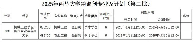 根据《西华大学2025年硕士研究生招生复试录取工作办法》规定,现就开展我院第二批调剂复试工作有关事项公告如下: