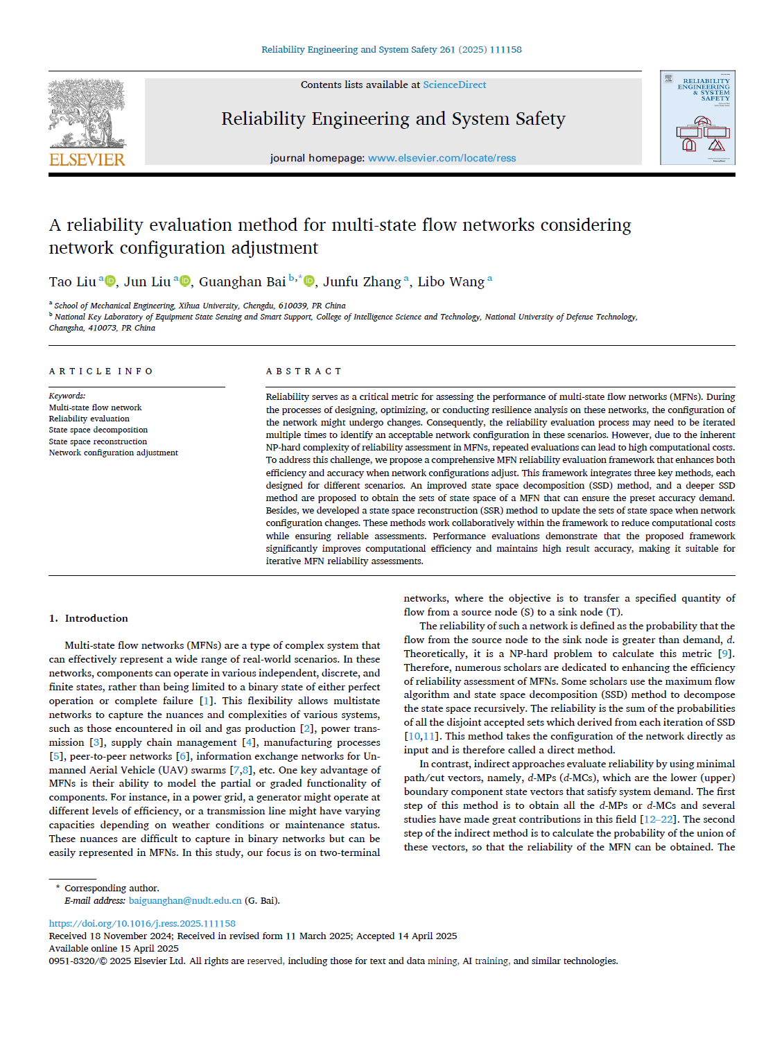 点击:339 近日,bv伟德国际体育官方网站张均富教授研究团队在可靠性旗舰期刊《Reliability Engineering and System Safety》(中科院SCI一区Top,影响因子为9.4) 发表题为A reliability evaluation method for multi-state flow networks considering network configuration adjustment的研究论文。团队刘涛老师为论文的第一作者,2024级硕士研究生刘俊为论文的第二作者,国防科技大学白光晗副研究员为通讯作者,西华大学为论文的第一完成单位。