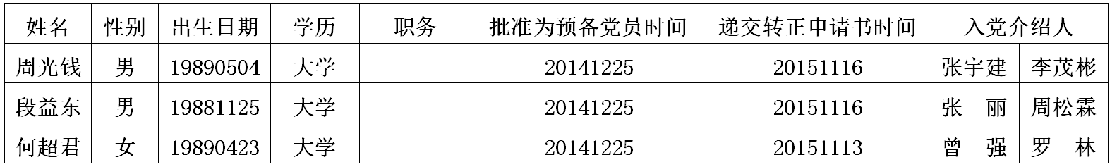 点击:320 根据西华大学bv伟德国际体育官方网站研究生2013年级支部委员会2015年12月14日决定,经bv伟德国际体育官方网站学生党总支审批,拟近期将周光钱等同志转为中共正式党员,现将有关情况公示如下: