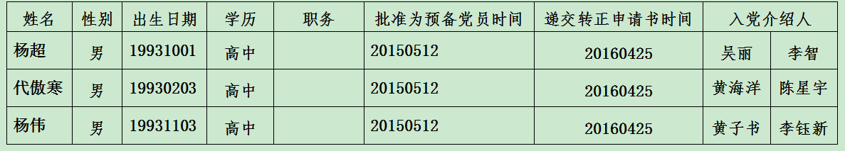 点击:212 根据机械工程学院支部委员会2016年5月3日决定,经机械工程学院学生第三联合党支部提名,机械工程学院党总支审批,拟将杨超、代傲寒、杨伟同志转为中共正式党员,现将有关情况公示如下:
