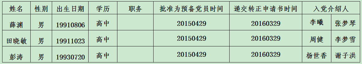点击:666 根据机械学院支部委员会2016年4月27日决定,拟于近期讨论薛渊、田晓敏、彭涛等同志转为中共正式党员,现将有关情况公示如下: