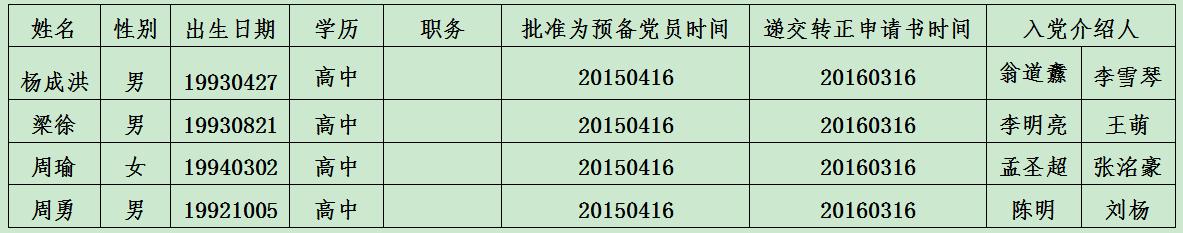 点击:133 根据机械学院支部委员会2016年4月27日决定,拟于近期讨论杨成洪、梁徐、周瑜、周勇等同志转为中共正式党员,现将有关情况公示如下: