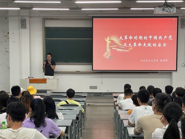 在专题学习会上,张明晖老师做了题为《大革命时期的中国共产党以及大革命失败的启示》。在报告中,张老师深入浅出,严谨而又不失幽默地带我们重新回到了1924至1927这段波澜壮阔的奋斗岁月。学习会主要从五个方面回顾了这段岁月:一、大革命的背景,二、国共第一次合作,三、党的建设:成长必经之路,四、四一二反革命政变后的艰辛,五、大革命失败的启示。通过以上学习,同学们都深切的了解到党在不同时期的思想、路线和政策转变、国共合作的失败的原因以及大革命失败对我们中国共产党的启示。在张老师讲述下,同学们感受到了虽然当时国民党叛变革命实行屠杀政策,使处于幼年时期的党猝不及防,遭到巨大的损失,但是党并没有被巨大的困难压倒,而是以大无畏的革命精神领导人民顽强地战斗。也正是国民党的背叛,使我们的党得到了极大地成长,中国共产党人和中国人民的觉悟也有了明显提升,也为我们党后来实行土地革命和武装起义的总方针打下了基础,为党从失败走向新胜利指明了出路。