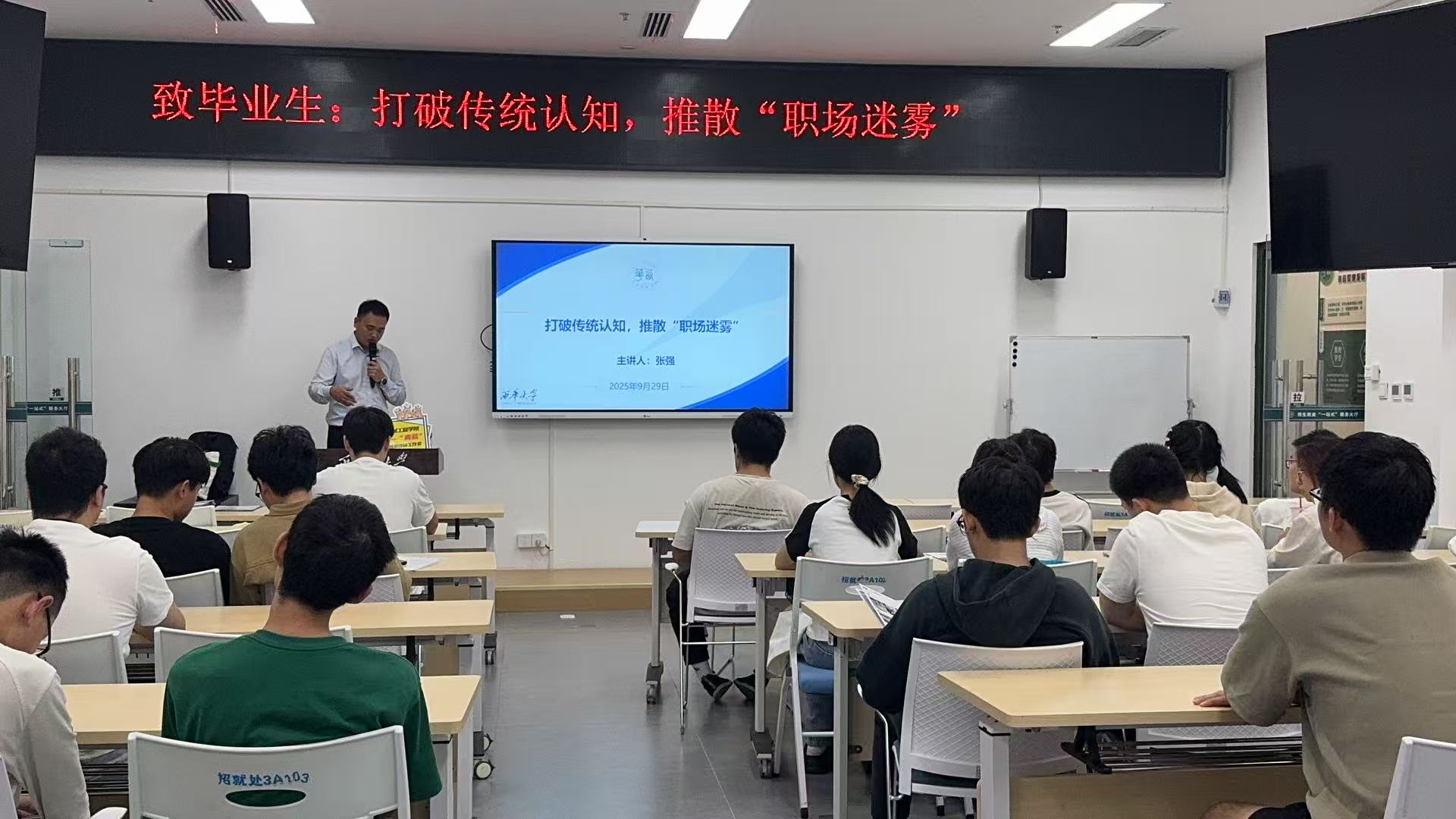 本次讲座以“致毕业生:打破传统认知,推散职场迷雾”为主题,旨在帮助步入求职阶段的2026届毕业生破除就业认知误区,明确职业方向。讲座中,张强校友结合自身从校园到职场的十余年成长经历,从角色转变、能力提升、职业选择等多个维度,分享了真实的职场感悟与实践经验。他提到,毕业生无需追求一步到位的理想工作,而是要在实践中积累经验、明确自身优势,逐步找到契合长期发展的职业赛道。其接地气的分享让在场学生倍感亲切,现场不时响起阵阵掌声。