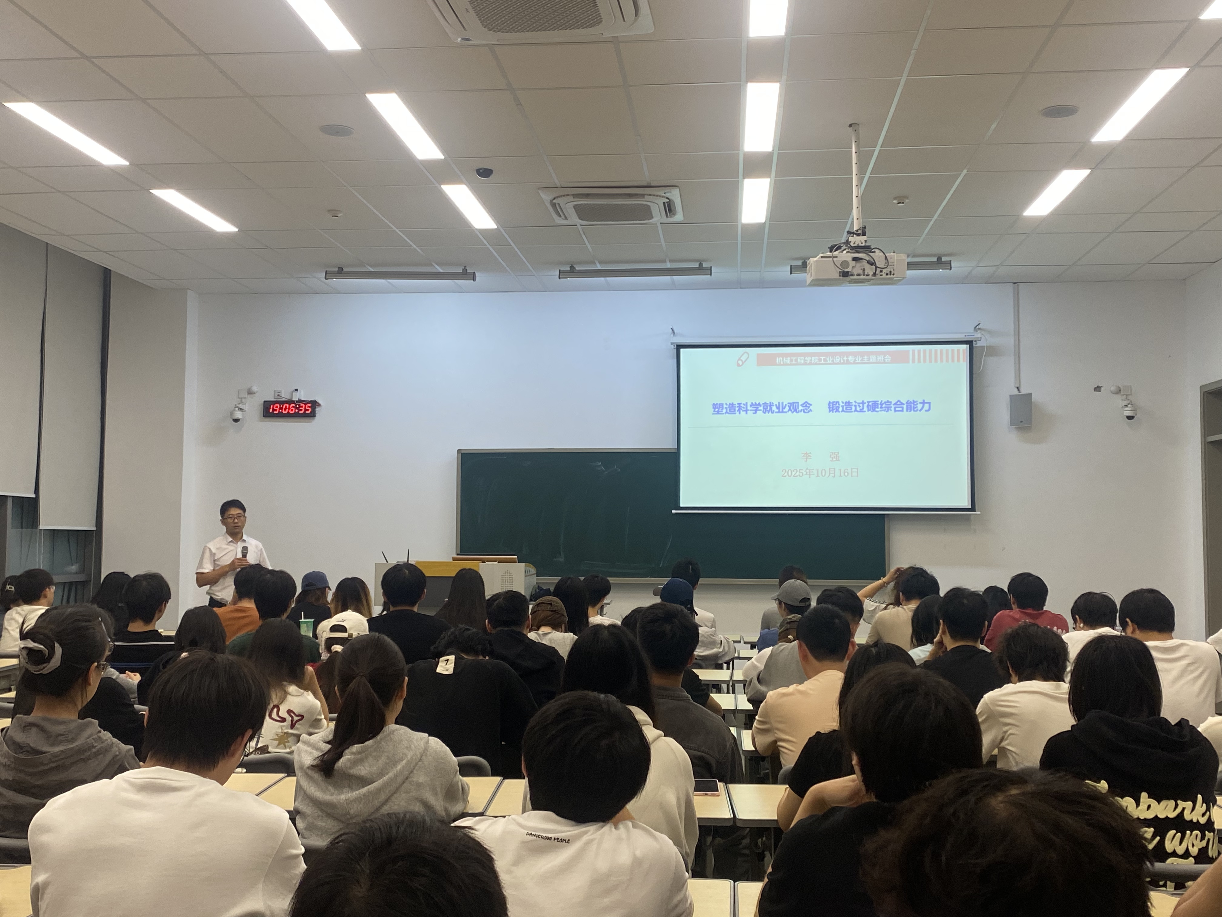 10月16日晚7点,李强副书记面向工业设计专业大四年级全体学生,举行了一场题为“塑造科学就业观念,锻造过硬综合能力”的专题就业指导讲座。他结合详实的数据和案例,深入剖析了当前复杂严峻的就业市场形势与行业发展趋势,引导同学们正视挑战,把握机遇。他强调,面对激烈的竞争环境,树立科学的就业观念至关重要。鼓励同学们要拓宽视野,将个人理想融入国家发展大局,勇于到祖国需要的地方建功立业;要合理调整就业预期,秉持“先就业、后择业”的务实态度。要坚定专业自信,看到工业设计领域广阔的发展前景。他勉励同学们积极参与实践,不断提升自身的核心竞争力。