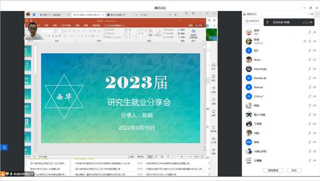 点击:804 为应对疫情暂缓返校对2023届研究生就业工作的冲击,9月16日陈昶老师组织2023届研究生召开线上会议,向广大毕业生分享了求职技能技巧和就业资讯获取渠道,为2023届研究生好就业、就好业做足准备。
