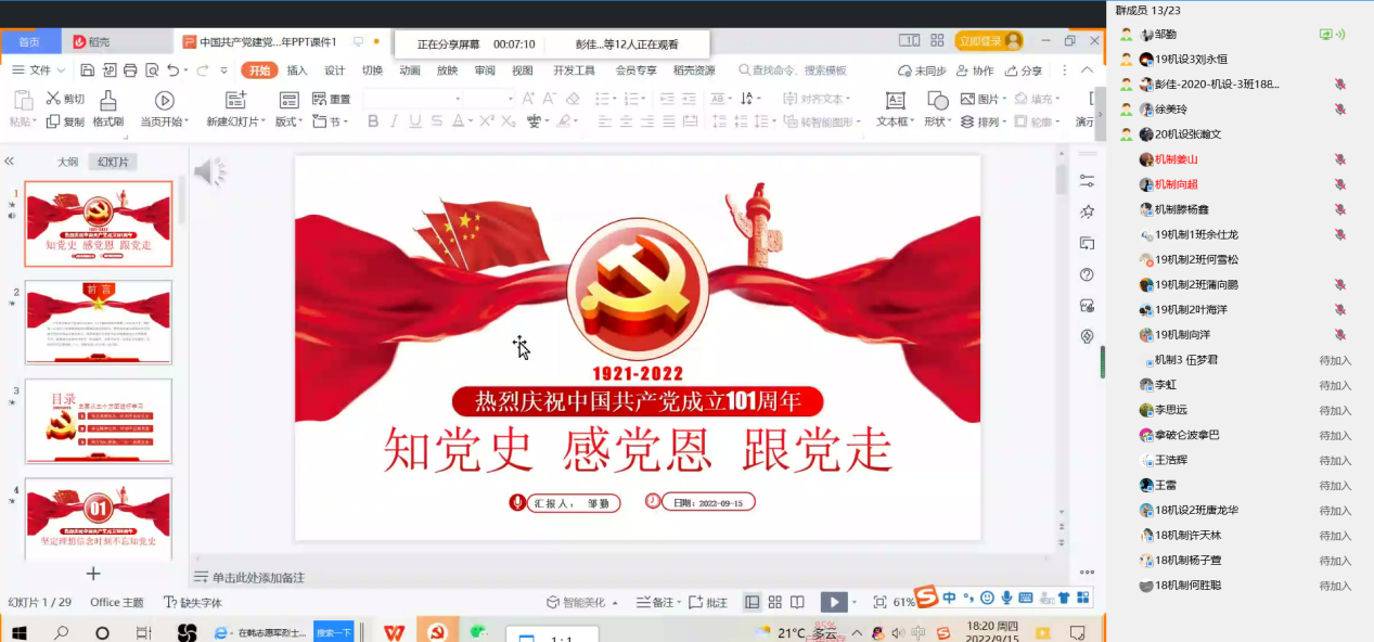 为持续弘扬伟大建党精神,以饱满的热情向建党101周年献礼,以优异的成绩迎接党的二十大胜利召开,bv伟德国际体育官方网站学生第一联合党支部于9月15日18:00通过线上会议的形式召开了“学党史,感党恩,跟党走”的主题党日活动。支部书记邹勤老师、支部全体党员以及积极分子参加了本次活动,活动由邹勤主持。